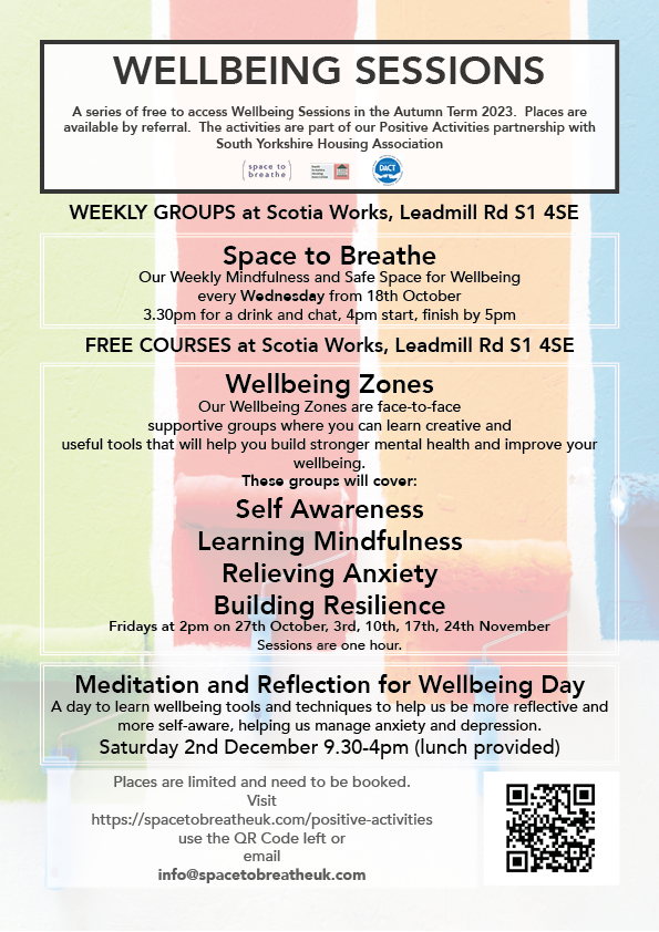 “Space to Breathe” is our new Wednesday Wellbeing Session is our weekly wellbeing and safe space session which will involve the chance to chat and have a drink, mindfulness reflections, wellbeing tools and ideas and the chance to spend time in a relaxing, calm and creative space.