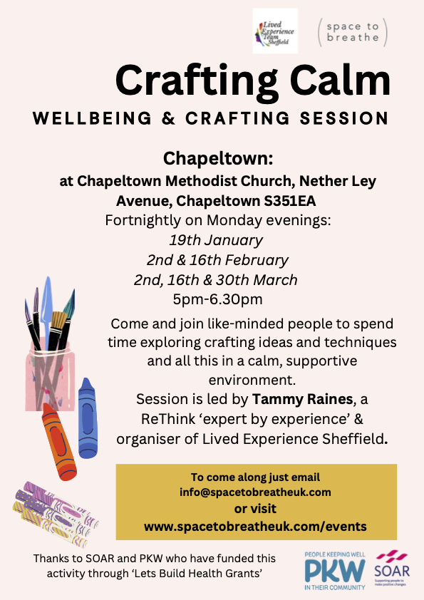 Come along to the next Crafting Calm event as Tammy Raines creates a crafting and wellbeing space to help you try out new skills and give you a space to chat and share about your wellbeing. Expect a whole host of craft activities, a good cuppa and like minded people.